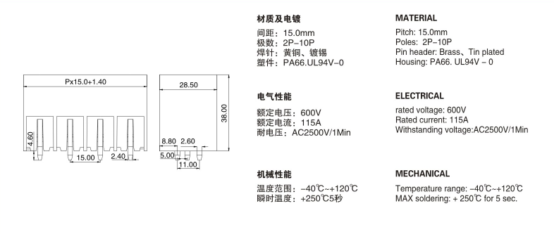 Pitch: 15.0mm; Poles: 2P-10P; Rated Voltage/Current: 600V/115A